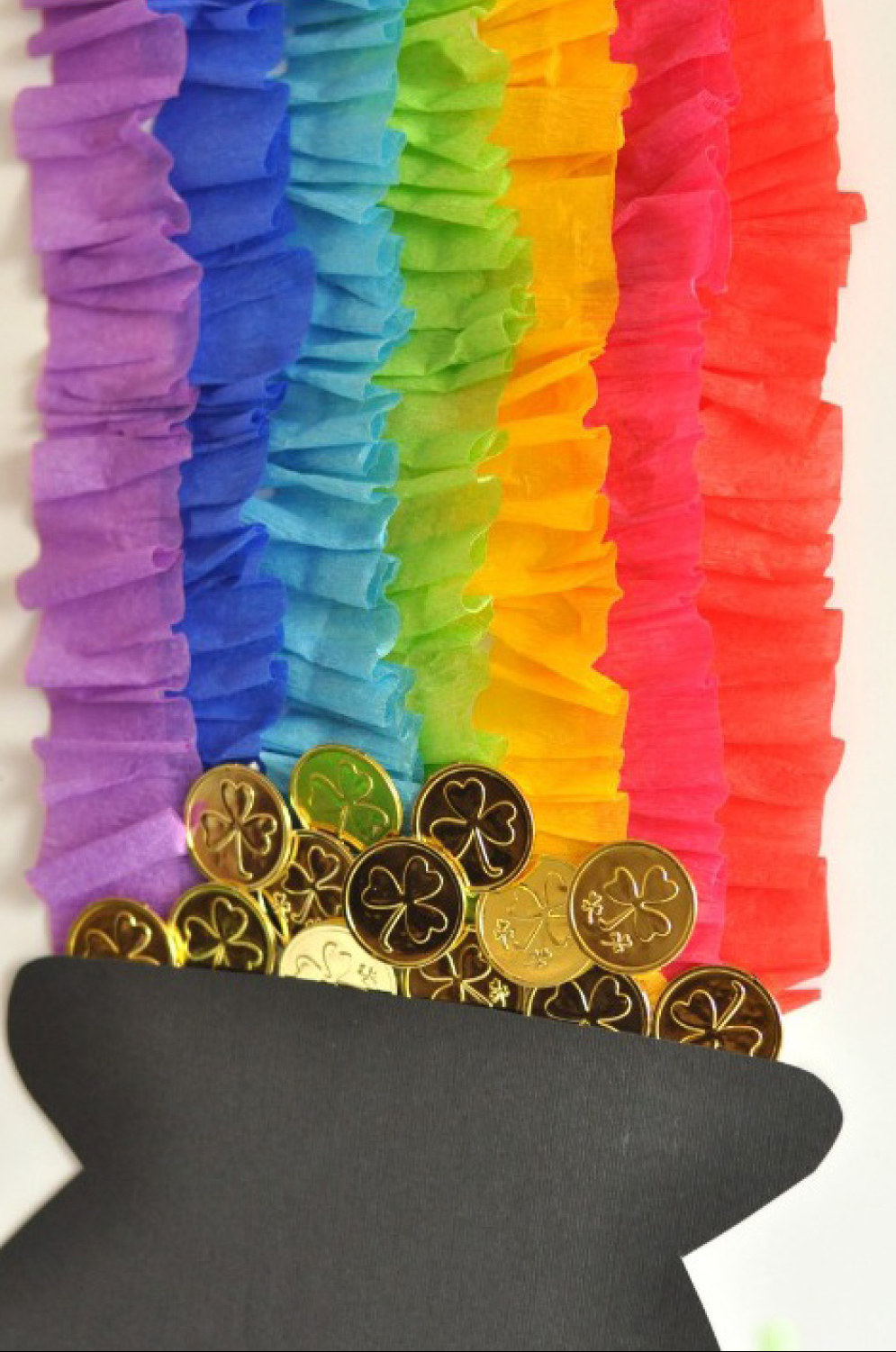 Get kids involved in helping make your St. Patrick’s Day decorations. Nothing feels as happy as a good old-fashioned paper chain. Put together one (or several) using strips of construction paper the same colors of the rainbow (red, orange, yellow, green, blue and purple). At the end of your rainbow paper chain you will of course want to attach a pot of gold. Cut out a simple black pot and handle out of black construction paper and a few gold coins (add gold glitter for an extra touch), and attach to the end of your paper chain. You could display your chain on a wall or hang it from the ceiling.