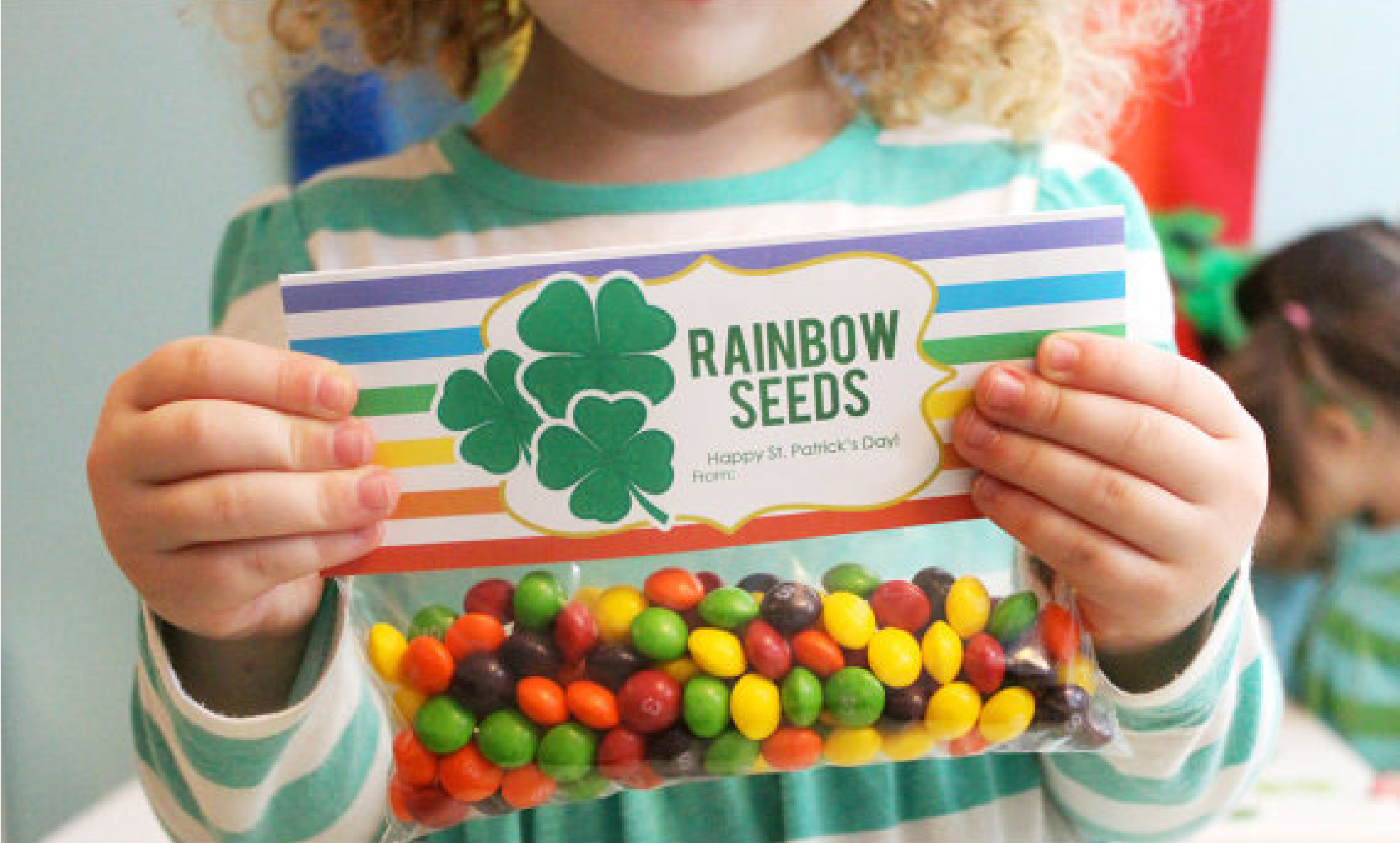 Skittles make a perfect St. Patrick’s Day favor. Send these colorful treat bags to school for all the students in your child’s class, or just make them a special addition to their lunch boxes that day! Fill snack-sized bags with Skittles, staple a festive tag to the top, and you will have “rainbow seeds” all ready to go! You can create your own party tags at home!